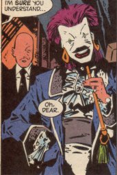 Only has average strength and agility for a man of his age, size and fitness and relies on razor-sharp wit to enrage and annoy the living hell out of his adversaries to the point of blinding and irritating frustration, which he will exploit himself. His main asset is insanity. He evades his opponents by dancing around them as he heckles them into expending their energy. Has no other superhuman powers or abilities